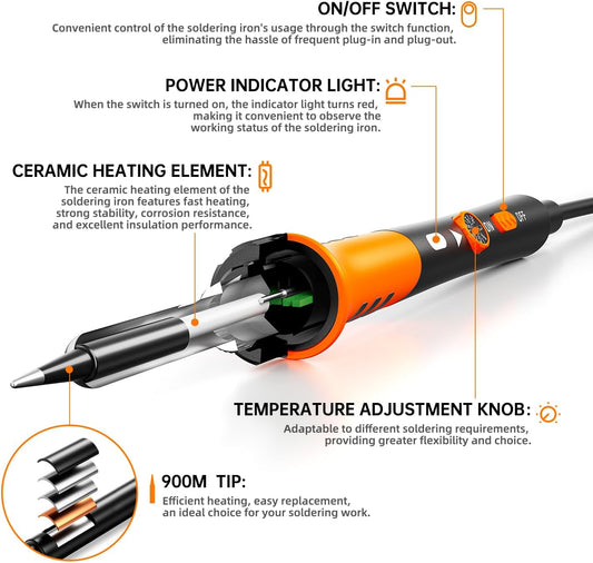 60W Adjustable Temperature Soldering Iron Kit - 9-in-1 With 5 Tips, Solder Wire Stand for Soldering and Repair
