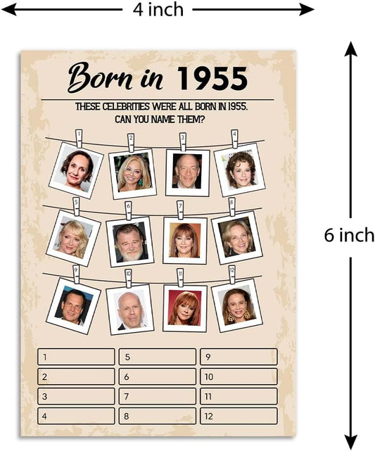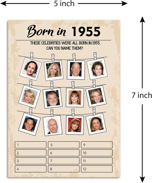 70th Birthday Party Games, Set of 2 Activities for 15 Guests, Born in 1955 Games Bundle, Birthday Party Supplies for Adults, Pack of 30 Cards