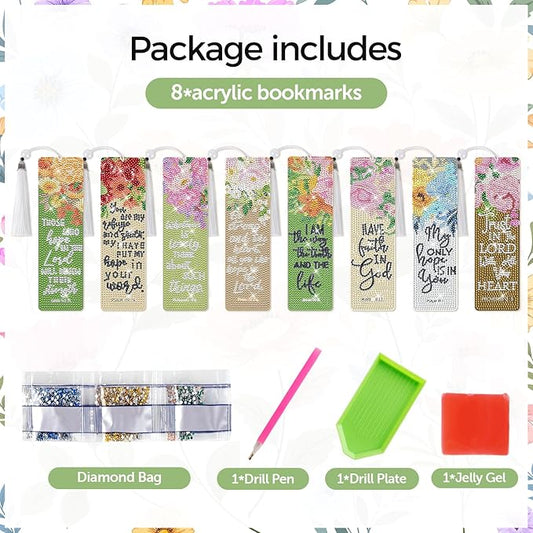 8 Pieces Christian Bible Verse Diamond Art Bookmarks 5d Christian Beaded Bookmark Acrylic Tassel Bookmark for DIY Making Beginners Kids Adults Arts Craft Supplies (Floral)