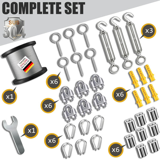 1/8 Inch Stainless Steel Cable Kit 164FT, 7 x 7 Strands Wire Rope with Aluminium Sleeves & Thimbles for Deck Railing, String Light Hanging, Shade Sail, Garden and DIY Projects