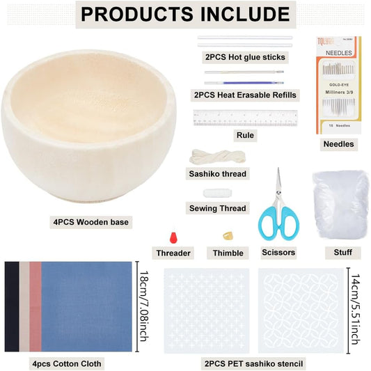 ACRNIGHEET 4 Set Sashiko Pin Cushion Bowls Making Kits, Embroidery Pin Cushion for Sewing, Sewing Pins Cushion, Wooden Base Japanese Traditional Style Sewing Needle Holder, DIY Crafts Home Use
