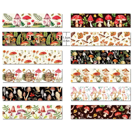 Adirasenotek 12 Rolls Mushroom Washi Tape Set,Vintage Washi Tape Decorative Paper Stickers Decorative Tape,DIY Art Crafts Wrapping Decor for Gifts Wrapping