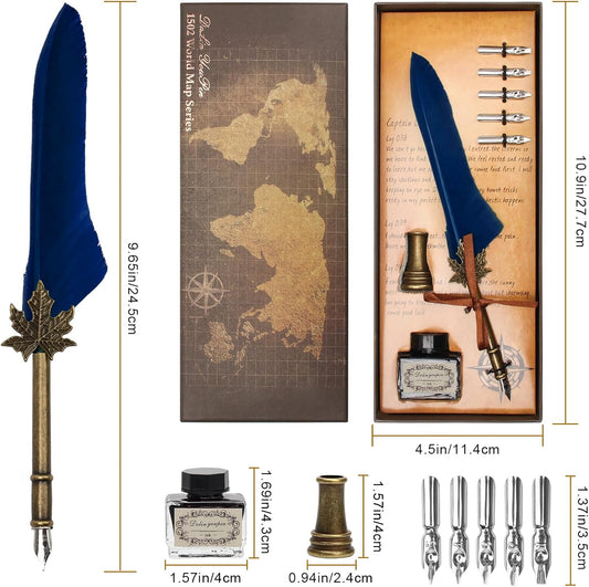 AHIER Quill Pen and Ink Set, Feather Pen Quill Pen Set Includes 5 Steel Replacement Nibs,Pen Nib Base and Dip Ink Bottle for Antique Calligraphy (Blue)