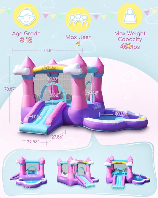AirMyFun Pink Indoor/Outdoor Inflatable Bounce House for Kids 3-8 - Bouncy Castle with Slide, Blower, Water Pool & Ball Pit