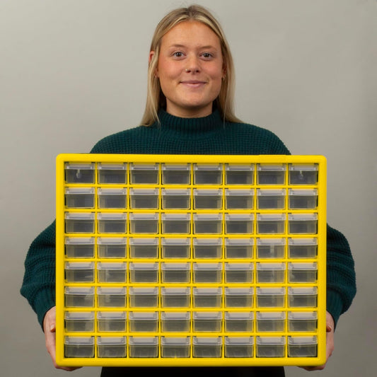 Akro-Mils 64-Drawer Plastic Drawer Storage Cabinet for Garage Organization, Bead Organizer, Building Bricks Storage, Teacher Toolbox, Makeup Organizer, 20" W x 6" D x 16" H, 10164 Yellow