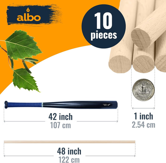 ALBO 1" x 48" Wooden Dowel Rods Set - 10 Pack Birch Natural Long Craft Sticks Rails Shelf Supports Garden Hardwood Smooth Finish Woodworking Material DIY Furniture Bulk Professional