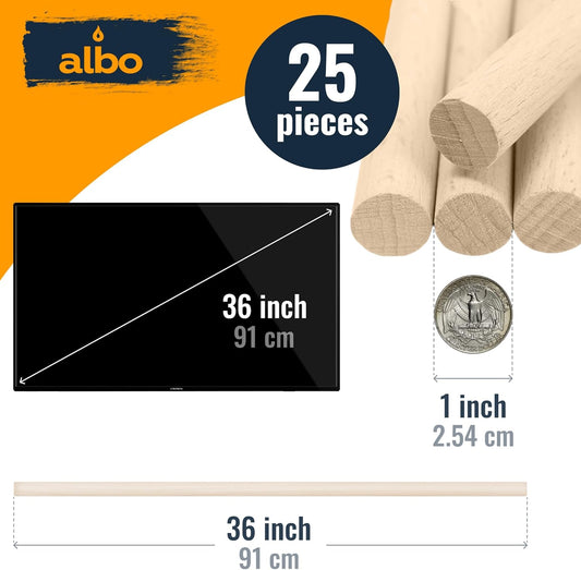Albo 1" x 36" Wooden Dowel Rods Set - 25 Pack Birch Natural Long Craft Sticks Woodworking Furniture Garden Structures Hardwood Sanded Smooth Railings Supports Decor Crafts DIY Projects