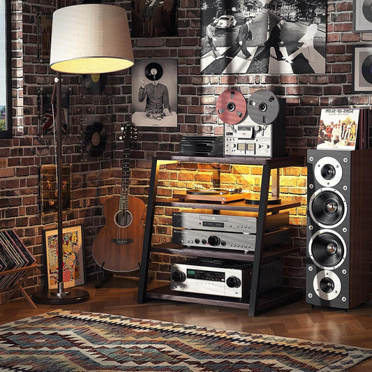 Armocity 4-Tier AV Media Stand with Power Strips, Stereo Stand with LED Lights, Audio Tower Rack with Adjustable Shelves, Small Entertainment Center, 30'', Rustic Brown