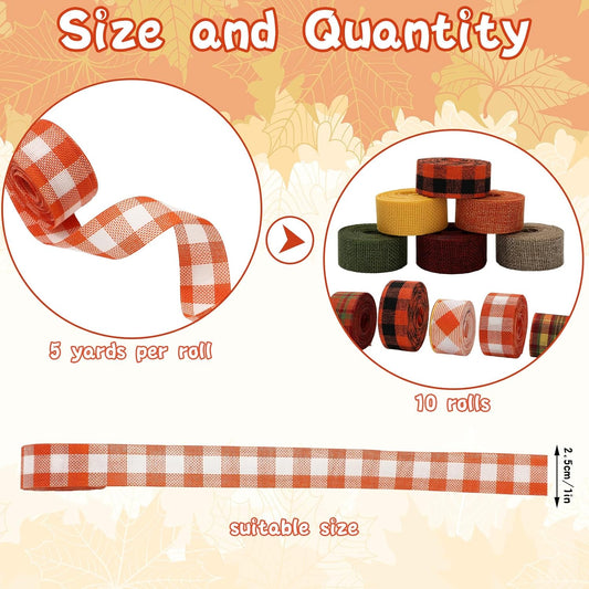 10 Rolls 50 Yard Fall Plaid Burlap Ribbon Rolls 1 Inch Autumn Gift Wrapping Ribbon Decorative for DIY Crafts Wreath Bow Making Supplies Home Decor