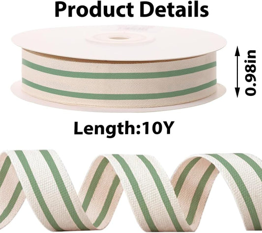 10 Yards Green Natural Cotton Ribbon for Crafting Sewing, 1 Inch Double Sided Webbing Straps Ribbons for Gift Wrapping, Birthday Wedding Christmas Ribbons for Trees DIY Crafts Sewing