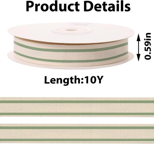 10 Yards × 3/5 Inch Green Natural Cotton Ribbon, Double Sided Webbing Straps Ribbons, Birthday Wedding Valentines Ribbons for Crafting, DIY Sewing, Gift Wrapping