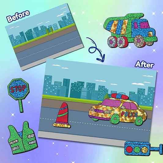 ATFUNSHOP Magical Foil Art Space Dinosaur Traffic Construction & Airplane - No Mess Foil Craft Kit for Kids Ages 4 5 6 7 8 9 Fun Creative DIY Activity, Ideal Birthday Gift for Boy
