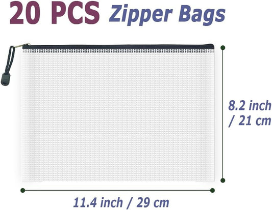 AUSTARK 20 Pcs Zipper File Bags, Plastic Mesh Pouch, Board Game Storage Bag, Waterproof Bags for Office School (A4 Size 13.4''x9.4'', White and Black)