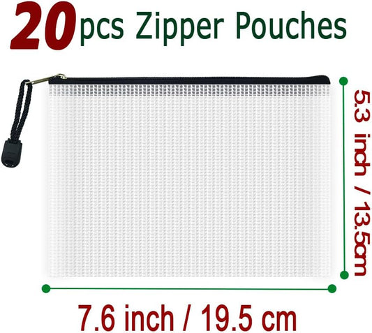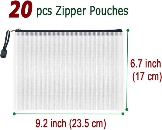 AUSTARK 20 Pcs Zipper File Bags, Plastic Mesh Pouch, Board Game Storage Bag, Waterproof Bags for Office School (Multi-Size, White and Black)