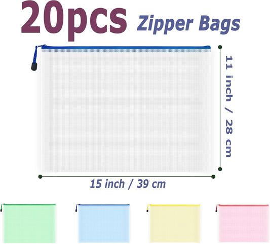 AUSTARK 20 Pcs Zipper File Bags, Plastic Mesh Pouch, Board Game Storage Bag, Waterproof Bags for Office School (A4 Size 13.4''x9.4'', Multicolored)