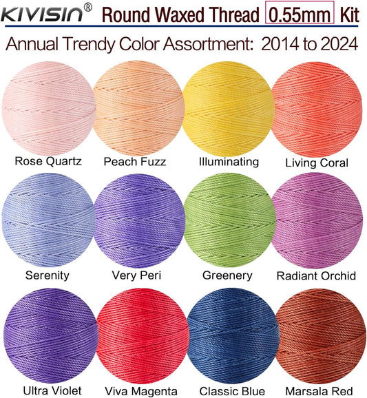 10-Year Popular Assorted Colors Round Waxed Thread -0.55mm 70 Yards 12 Spools Stiff Polyester Wax Cord for Beading, Leather Sewing, Bookbinding, Bracelets Braiding, Micro Macrame Craft Making
