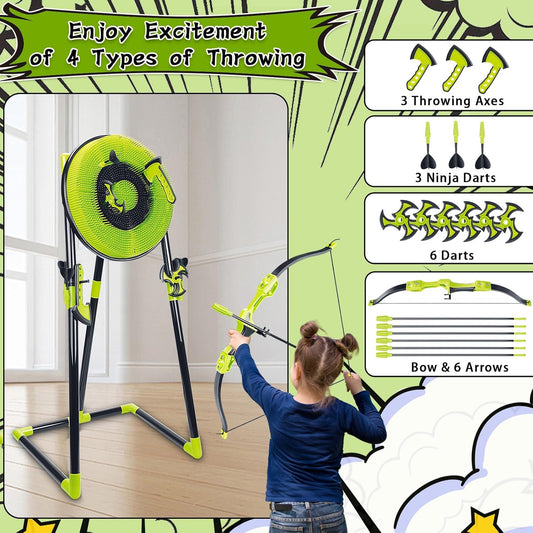 Axe Throwing Game for Backyard - 4 in 1 Outdoor Games for Kids Adults Family - Bristle Target, Bow & 5 Arrow, 3 Throwing Axes, 3 Ninja Stars, 6 Darts Includes - Archery Games for Yard Lawn Carnival