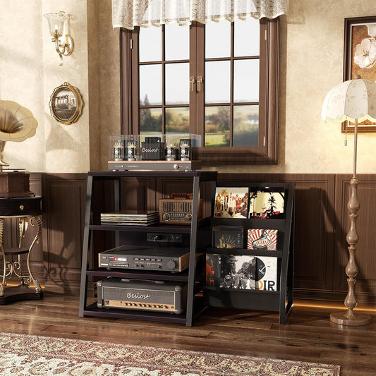 AV Media Stand with Outlets, Stereo Stands and Racks with Vinyl Storage, Stereo Stand with Record Storage, Audio Stereo Rack Cabinet, Turntable Console Stand with LED lights, 4 Tiers, Black Ebony