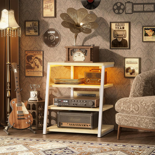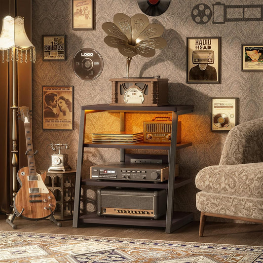 AV Media Stand with Outlets, Stereo Stands and Racks with Vinyl Storage, Stereo Stand with Record Storage, Audio Stereo Rack Cabinet, Turntable Console Stand with LED lights, 4 Tiers, Rustic Brown