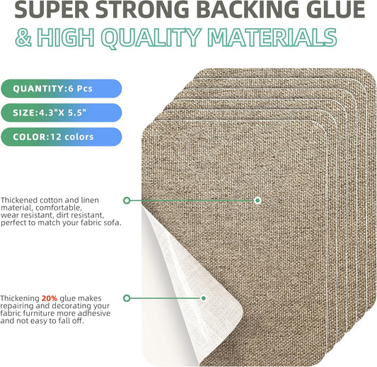 Azobur Coarse Linen Repair Patches, 6 Piece Self-Adhesive Linen Fabric Patches, Multi Color, Can be Used for Linen Sofa Repair and Linen Clothes Repair, Quick Fix Sofa.(Khaki)
