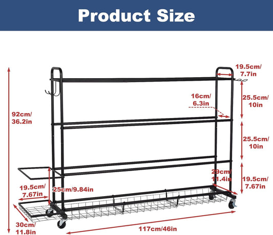 Basketball Rack, Shooting Training Rolling Ball Stand, Garage Organizer with Wheels, 4-Layer Sports Equipment Storage Holder with Baskets and Hooks for Soccer Baseball Footballs Volleyball