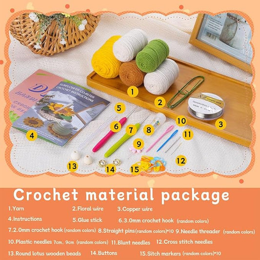 Beginner Crochet Kits, 5-Piece Sunflower Coaster Set, Plant Crochet kit, Adult Crochet Beginner Kits, with Step by Step Guide Video, Sunflower Crochet Material Tool