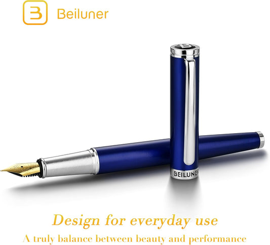 BEILUNER Luxury Fountain Pen Set,Solid 24K Gilded Fine Nib, Modern Classic Limited Edition -Includes 6 Ink Cartridges&Ink Refill Converter with Gift Case-Perfect for Men and Women(Charming blue)