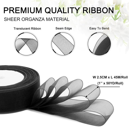 Black Ribbon for Gifts Wrapping, 1 inch 50Yard Sheer Organza Ribbon, Gift Wrap Chiffon Ribbons for Halloween, Fathers Day, Wedding, Party Decoration, Hair, Crafts, Flower Bouquet