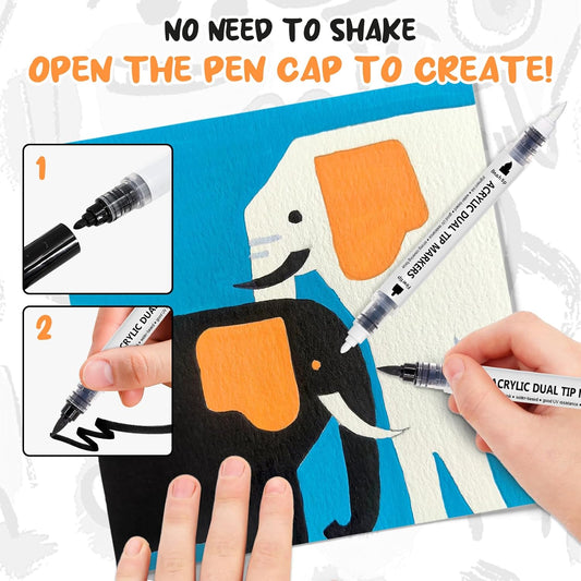 Black White Acrylic Paint Pen Brush, 6PCS Dual Tip Automatic Ink-control Acrylic Markers for Rocks, Metal, Glass, Wood, Fabric, Porcelain, Ceramic