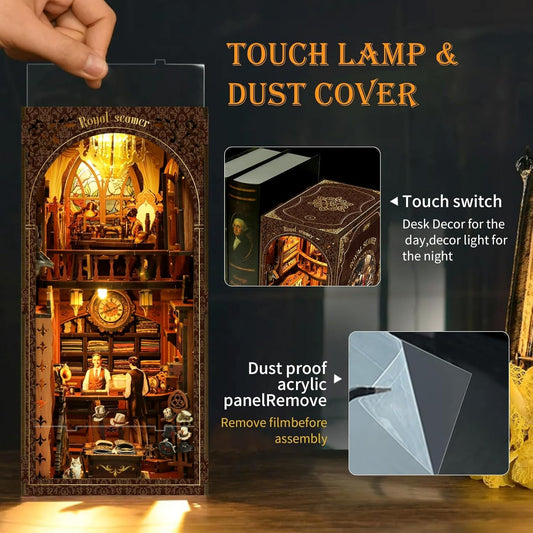 Book Nook Kit for Adults with Dust Cover & LED Light, DIY Miniature House Kit 3D Printed Booknook Wooden Puzzle Dollhouse Bookshelf Insert DIY Craft Model Build Gift for Birthdays, Royal Seamer