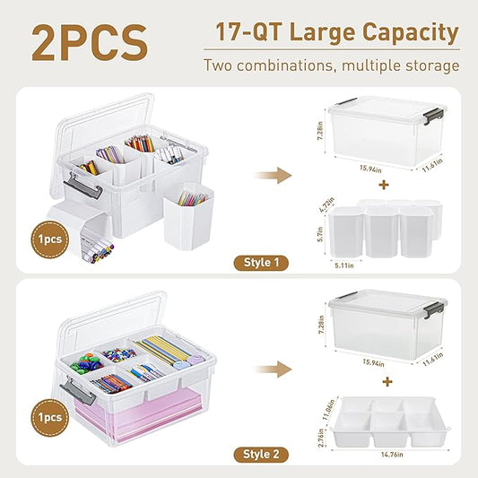 Citylife 17 QT Plastic Storage Box with Removable Tray and 6 Detachable Tall Inserts Craft Organizers and Storage Clear Storage Container for Organizing Crayon, Craft, Sewing, Playdoh, 2 Packs