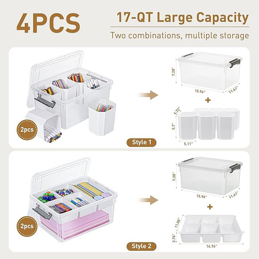 Citylife 17 QT Plastic Storage Box with Removable Tray and 6 Detachable Tall Inserts Craft Organizers and Storage Clear Storage Container for Organizing Crayon, Craft, Sewing, Playdoh, 4 Packs