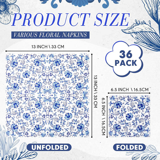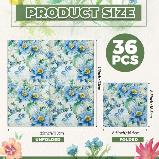 Crtiin 36 Pack 9 Styles Decoupage Napkins Assorted Floral Decorative Decoupage Napkins Chinoiserie Cocktail Paper for DIY Crafting Birthday Party, Each Unfolded 13 Inch(Blue Floral)
