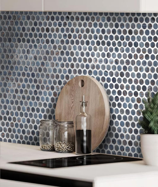 Denim Blue Penny Round Mosaic Glass Tile – 12.2 x 12.2 Inch - 10 Sheet Pack - Luxurious Design for Bathroom Walls, Kitchen Backsplash, Shower Walls - Elegant Wall Decor - NOT Peel and Stick Tile