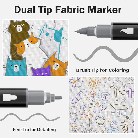 Dual-Tip Fabric Markers Permanent for Clothes No Bleed, Quick Dry & Non-Toxic Fabric Paint Pens Set for Canvas, T-Shirts, Bags, Textile, 5 Pack
