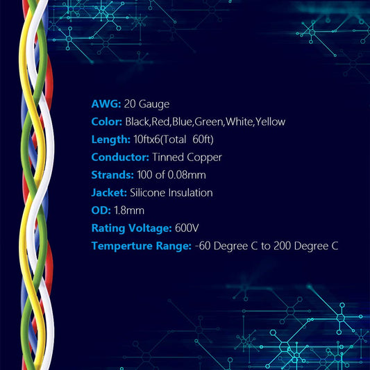Fermerry 20 AWG Stranded Wire Spool 10ft Each 6 Colors Flexible 20 Gauge Silicone Hook up Wire Kit Electrical Tinned Copper Wire