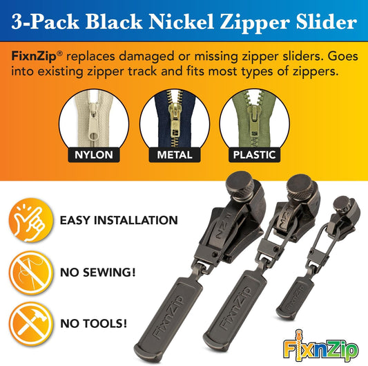 FixnZip (Black Nickel 3 Pack S,M,L) - Universal Zipper Repair Kit for Jackets, Luggage, Bags - Backpack Zipper Replacement Repair Kit