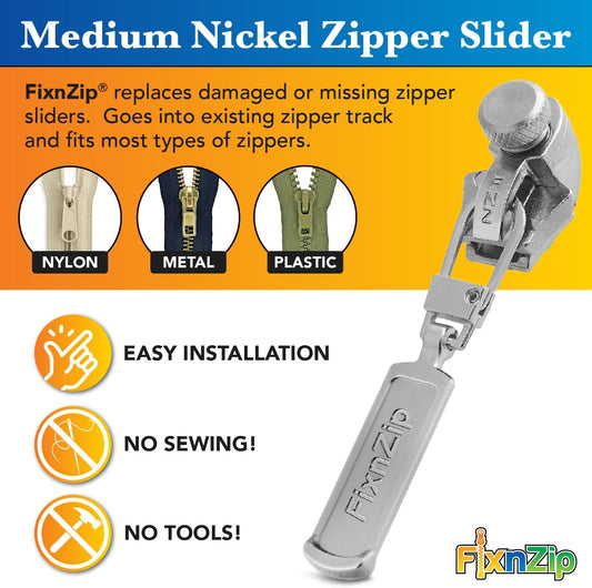 FixnZip (Medium, Nickel) - See Size Guide - Universal Zipper Repair Kit for Jackets, Luggage, Bags - Backpack Zipper Replacement Repair Kit - Instant Zipper Fix