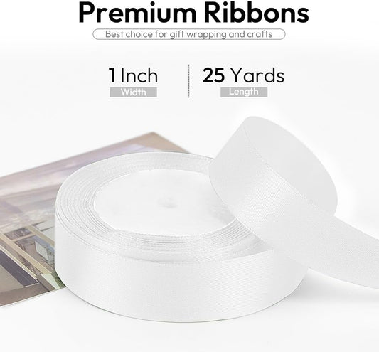 1 Inch 25 Yards Satin Ribbon White, Solid Color Fabric Ribbon for Gift Wrapping, Wedding, Polyester Gift Ribbon for Birthday Party Decoration, Craft, Hair, Floral, Sewing