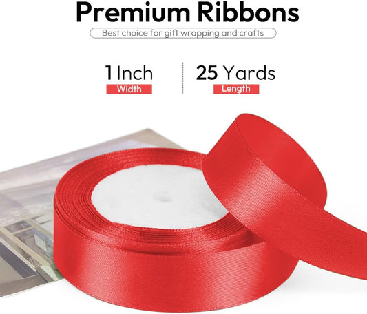 1 Inch 25 Yards Satin Ribbon Red, Solid Color Fabric Ribbon for Gift Wrapping, Wedding, Polyester Gift Ribbon for Birthday Party Decoration, Craft, Hair, Floral, Sewing