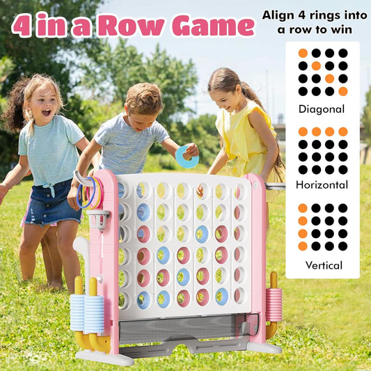 Giant 4 in-A-Row Connect Game Set, Adjustable Height Jumbo Yard Game with Basketball Hoop, Golf, Mesh Pocket & Ring Toss, Indoor Outdoor Family Backyard Party Game for Kids and Adults, Pink-White