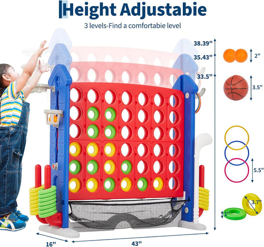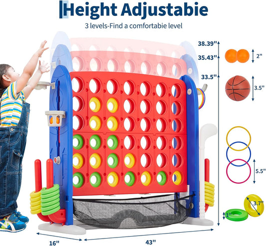 Giant 4 in a Row Game,Adjustable Height Board Jumbo 4-in-a-Row Game with Quick-Release Slider,Mini Basketball,Golf & Ring Toss Set for Family Party, Outdoor & Indoor