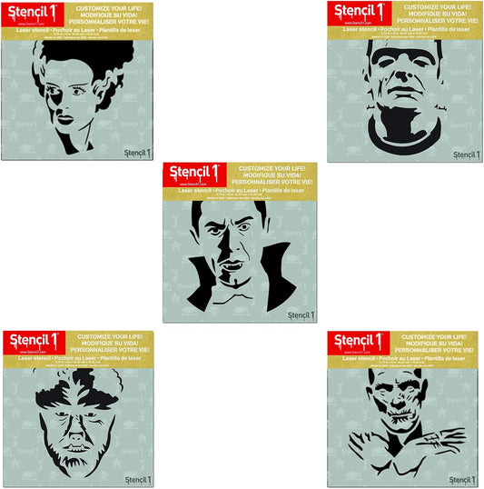 Halloween Monsters 5 Pack Stencil Set, Pumpkin Stencils, Halloween Motifs, Includes Dracula, Frankenstein, Bride, Werewolf, Mummy, Each Measure 5.75 x 6