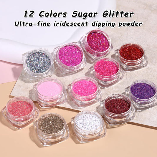 Holographic Sugar Glitter Powder for Nails, 12 Colors Iridescent Sugar Nail Dipping Powder Pigment Ultra Fine Sparkle Nails Gel Polish Glitter Dust Manicure Decoration for Home DIY Salon