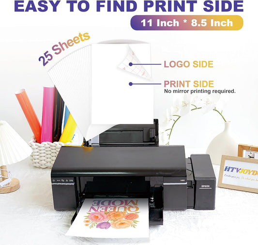 HTVJOYDO Iron-On Heat Transfer Paper for T-Shirts, 25 Sheets 8.5x11", Iron on Vinyl for Light Fabric, Printable Heat Transfer Vinyl for Inkjet Printer, Perfect for Summer Crafts