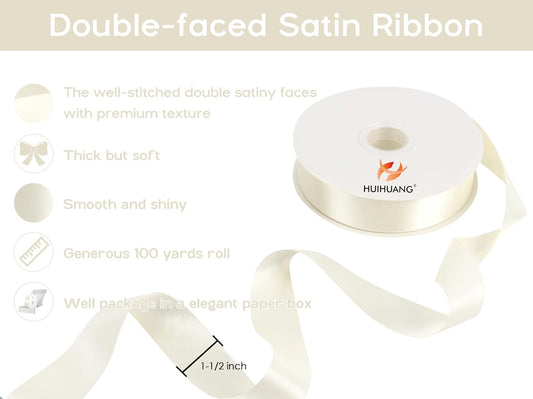 HUIHUANG Ivory Satin Ribbon 1-1/2 inch x 100 Yards Antique White Double-Faced Satin Ribbon for Flower Bouquet, Gift Wrapping, Eternal Roses, DIY Crafts, Bridal Shower Wedding Decor