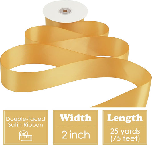HUIHUANG Old Gold Satin Ribbon - 2 inch Wide Double Face Gold Silk Like for Wedding, Crafts, Gift Wrapping, Christmas Decor, Bows - 25 Yards/Roll