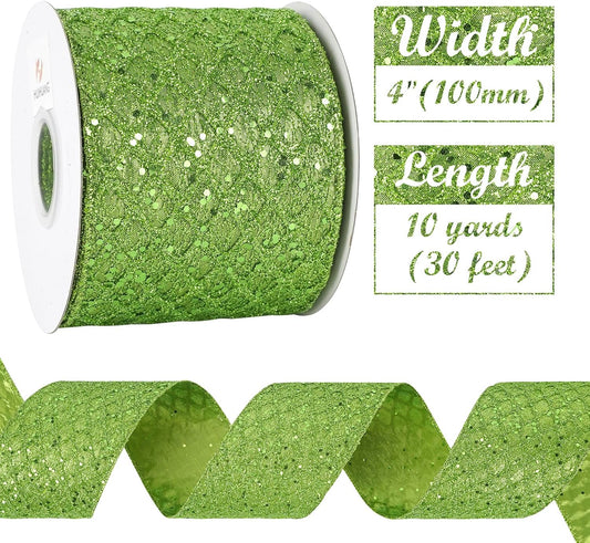 HUIHUANG Lime Green Glitter Wired Ribbon - 4 inch x 10 Yards (30 Feet) - Polyester Material - Perfect for Christmas, Halloween & More - Geometric Pattern - Wired Edges for Easy Shaping