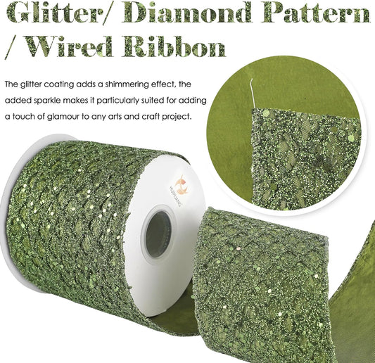 HUIHUANG Moss Green Wired Christmas Ribbon 4 inch Moss Glitter Wired Ribbon Diamond Mesh Wire Ribbon for X-mas Tree Decorations, Wreaths, Garland, Large Bows Making, Home Decor -10 Yards