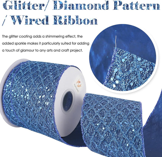 HUIHUANG Navy Blue Wired Christmas Ribbon 4 inch Navy Glitter Wired Ribbon Diamond Mesh Wire Ribbon for X-mas Tree Decorations, Wreaths, Garland, Large Bows Making, Home Decor -10 Yards